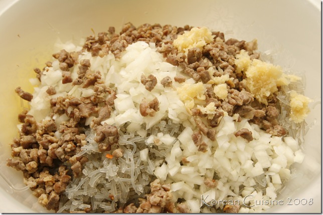 Then add about 1 cup of chopped up onions, 2 cups of chopped up glass noodles, 1/2 cup of chopped up carrots, and mix it around well.