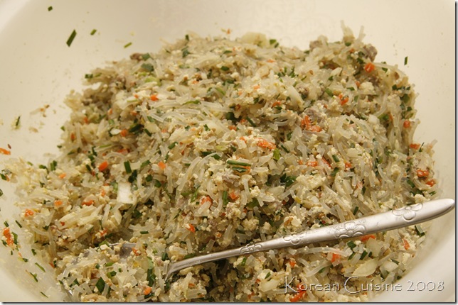 Chop up about 1 cup each of green onions, chives, and bean sprouts. Make sure to boil the bean sprouts and squeeze out all the excess liquid.