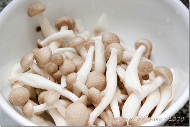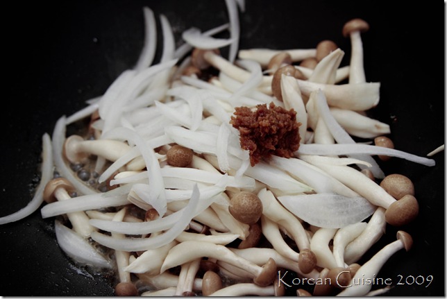 Add the mushrooms along with some sliced onions to the pot and saute it it with about 1/4 TB of dwen-jang.